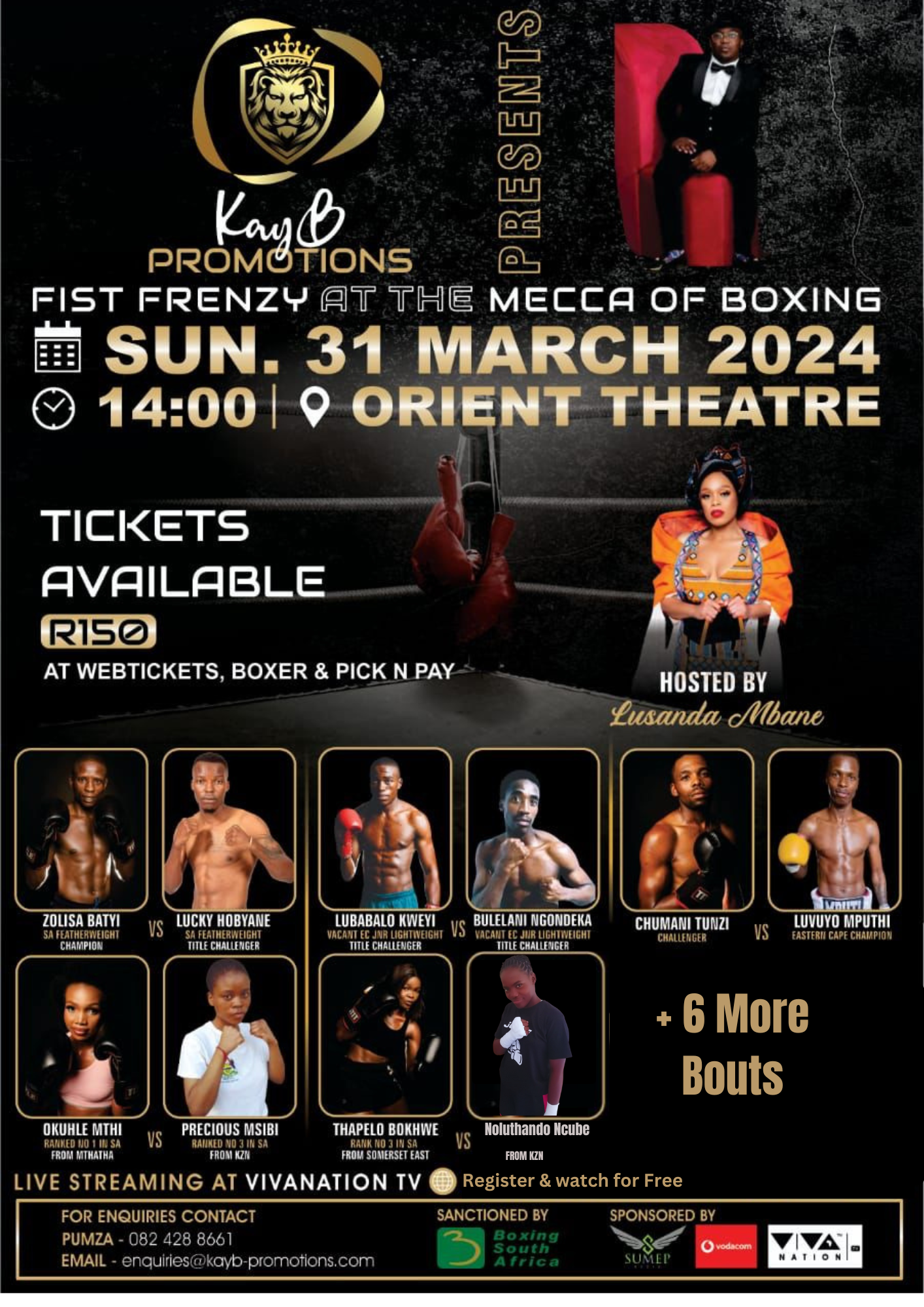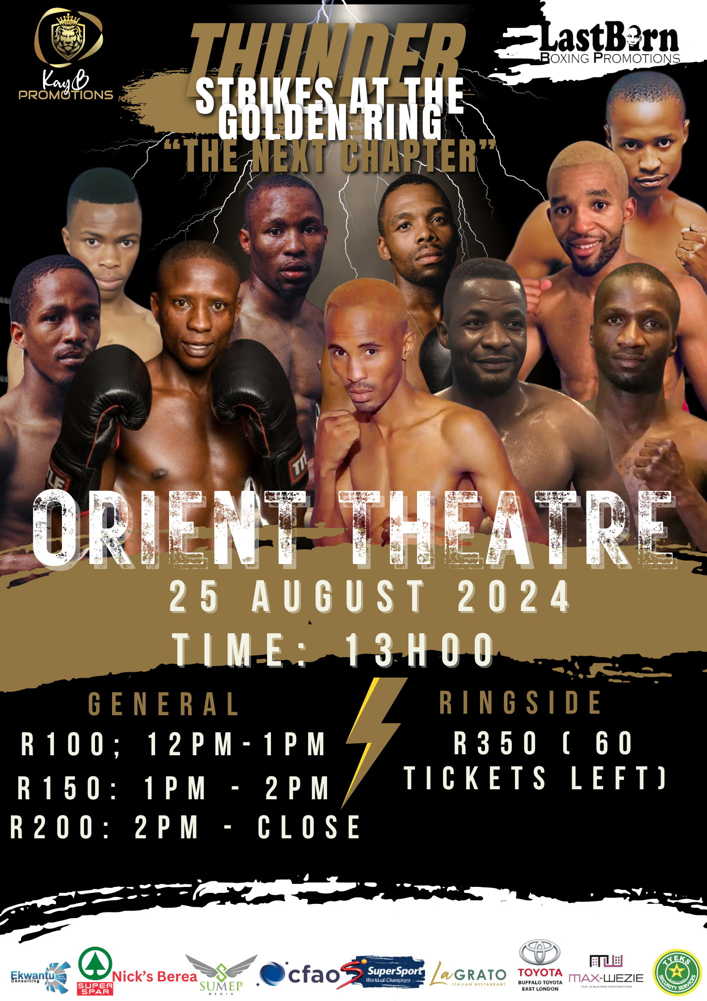 Held at the Orient Theatre in East London, Thunder Strikes at the Golden Ring is an electrifying boxing event hosted by KayB Promotions and Last Born Boxing Promotions. This event highlights rising stars and seasoned champions, delivering action-packed matchups that captivate fans and promote the growth of professional boxing in South Africa.